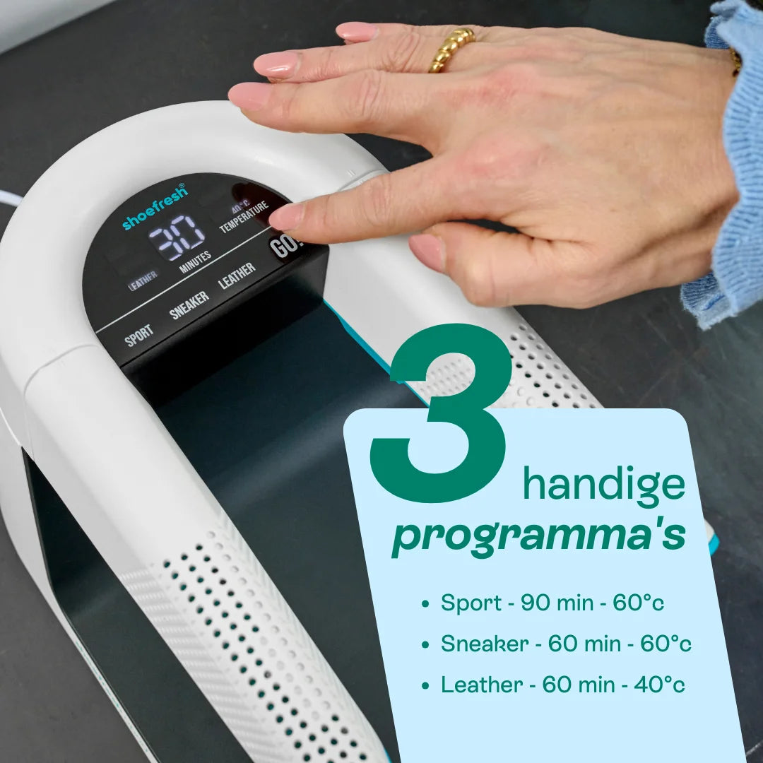 • De Shoefresh opod is beveiligd tegen oververhitting en de temperatuur in de schoenen wordt continue gemeten. Hierdoor is het uitgesloten dat schoenen te warm worden of beschadigen. Daarnaast is de Shoefresh gemaakt van een niet brandbare thermoplast kunststof.