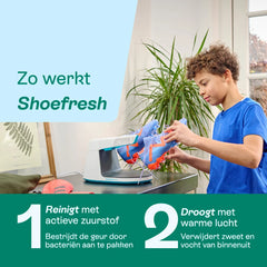 Tip: zet de Shoefresh in een goed geventileerde ruimte van minimaal 2,4 m³, zoals de bijkeuken, garage of hal. Op deze manier heb je geen last van de geur van je schoenen en de reiniging.