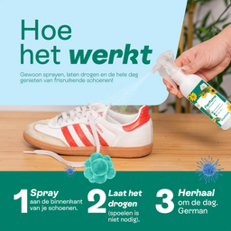 De warme, vochtige omgeving in je schoenen is de ideale broedplaats voor schimmels en bacteriën. Gemiddeld bevatten schoenen meer dan 400.000 bacteriën en schimmels! Dit leidt tot stinkende schoenen en kan tevens voetschimmel en kalknagel veroorzaken. Het is dan ook belangrijk om je schoenen -net zoals je kleding, sokken en ondergoed- regelmatig te reinigen en te drogen.
