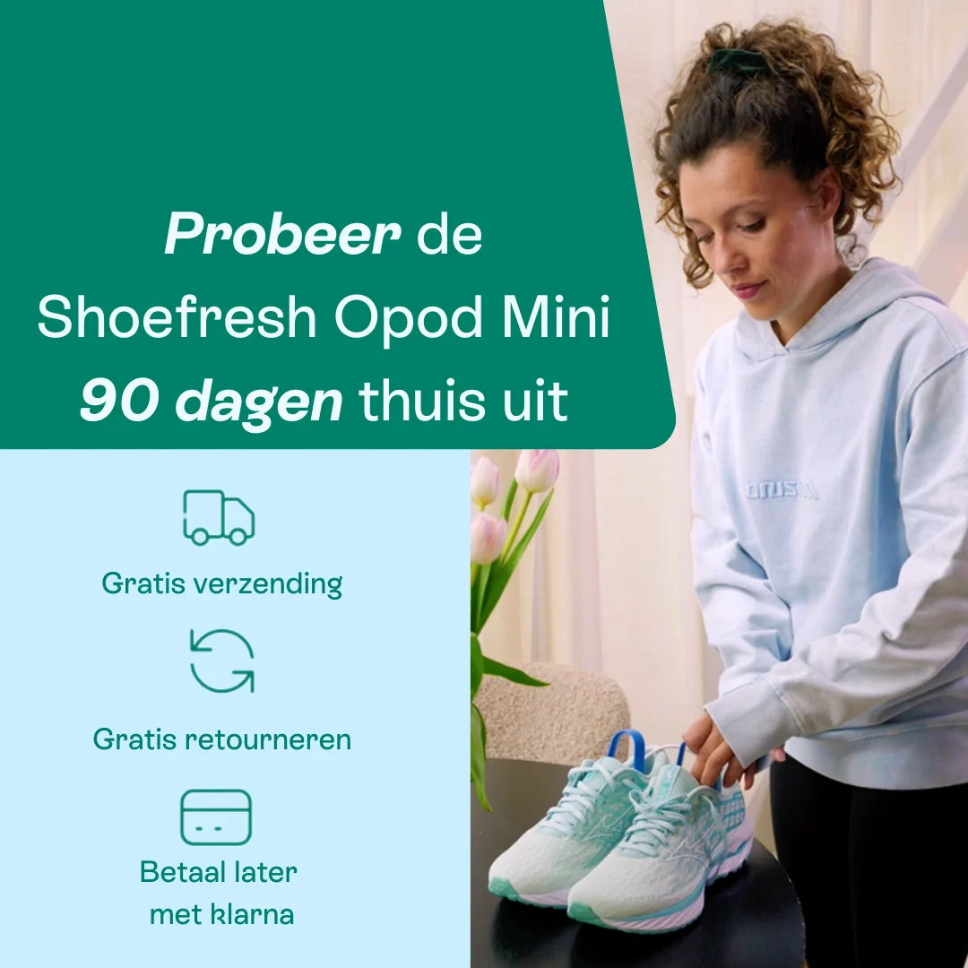 De Opod mini is dan wel klein van stuk maar zorgt er wel voor dat natte, stinkende schoenen tot het verleden behoren. Het gemak van de Mini is dat hij overal mee naar toe kan. Bovendien past de Mini in elk type schoen: van grote maten tot hoge laarzen.